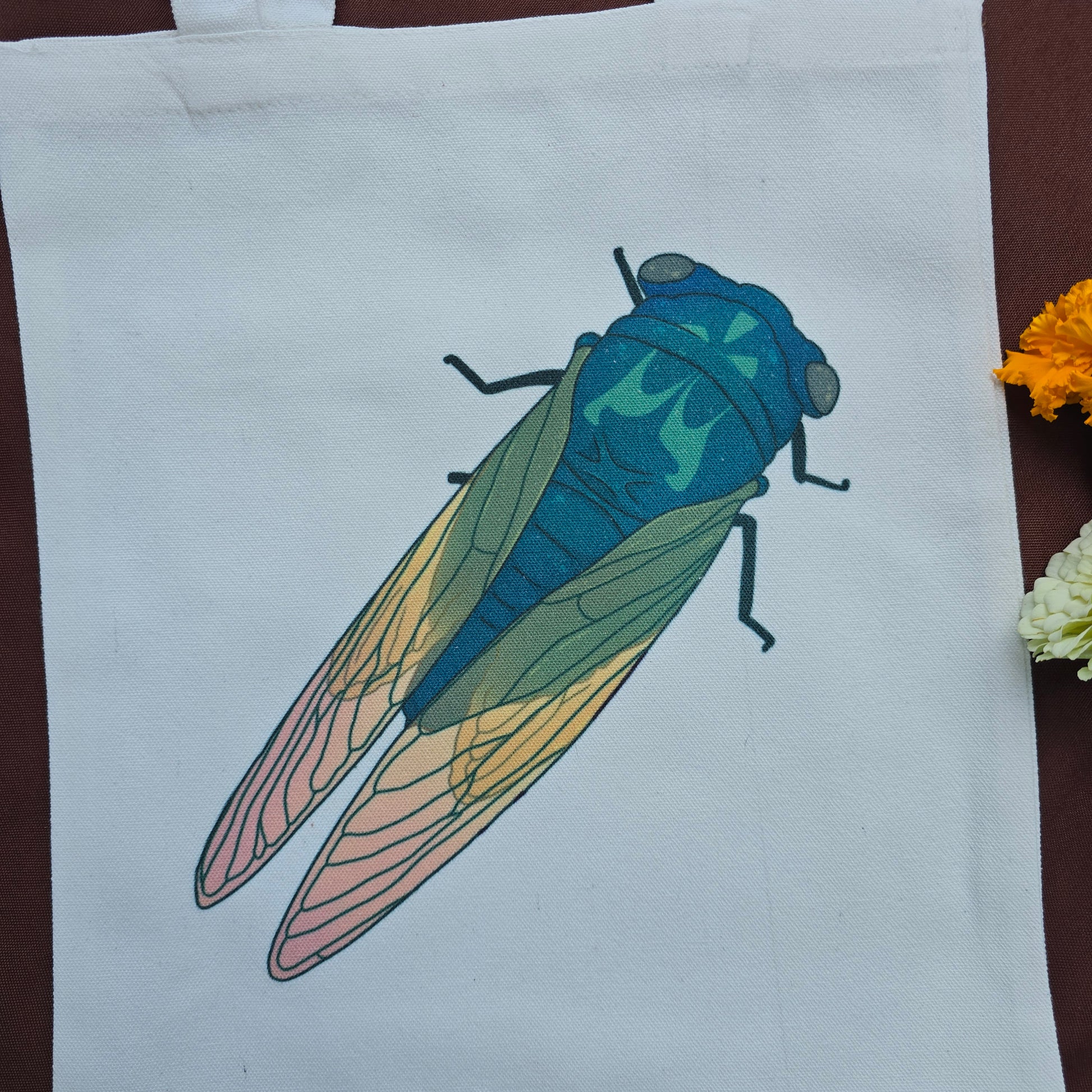 This stylish canvas tote is printed with a summer cicada on one side. The perfect size for book club, game night, or taking some items to work or class.